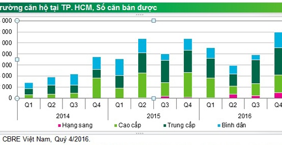 Theo CBRE Việt Nam, vào quý cuối năm 2016, số lượng căn hộ bán được tại TP. Hồ Chí Minh là 11.941 căn, tăng 52% so với quý trước và 11% so với cùng kỳ năm trước.
