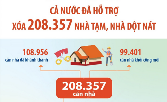 Cả nước đã hỗ trợ xóa 201.651 căn nhà tạm, nhà dột nátCả nước đã hỗ trợ xóa nhà tạm, nhà dột nát được 201.651 căn, trong đó khánh thành 105.968 căn và khởi công mới 95.683 căn. Như vậy, số nhà tạm, nhà dột nát của hộ nghèo, hộ cận nghèo còn lại cần xóa thuộc Chương trình phát động là 34,7 nghìn căn. -