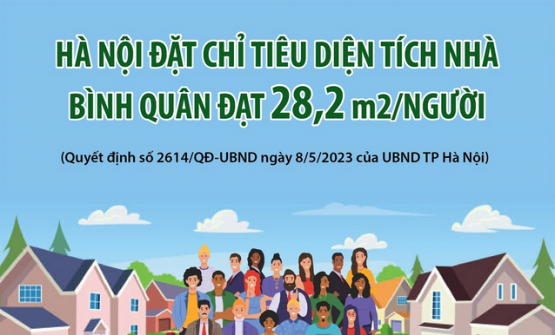 Theo Quyết định số 2614/QĐ-UBND ngày 8/5/2023 của UBND TP. Hà Nội phê duyệt Kế hoạch phát triển nhà ở TP. Hà Nội năm 2023, Hà Nội đặt chỉ tiêu trong năm 2023, diện tích nhà bình quân đầu người đạt 28,2 m2/người tổng diện tích sàn nhà ở đạt khoảng 6,965 triệu mét vuông.